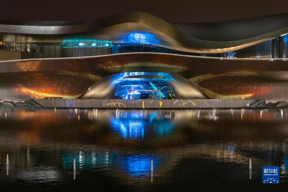 這是10月16日晚拍攝平面設計的全息投影2023成都世界科幻大會主場館——成都科幻館,品牌活動三星堆出土文物的AR擴增實境元素被燈光廣告設計投射在建筑的外立面上。